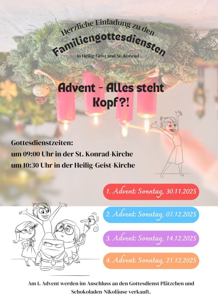 Im Advent finden die Familiengottesdienste an den Sonntagen in den Kirchen Heilig-Geist und St. Konrad unter dem Leitgedanken “Alles steht Kopf” statt. Die Gottesdienste beziehen sich unter anderem auf den gleichnamigen Film und stellen unsere Gefühle in den Vordergrund. Kommt vorbei und schaut, welche Gefühle im Advent auftauchen.