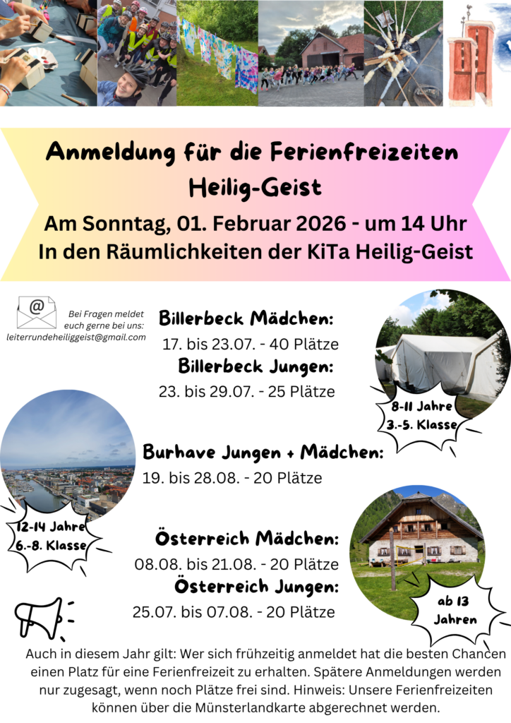 Am Sonntag, den 01.02.2026 findet die Anmeldung zu unseren Ferienfreizeiten in den Räumlichkeiten der Kindertagesstätte (KiTa) Heilig-Geist statt.