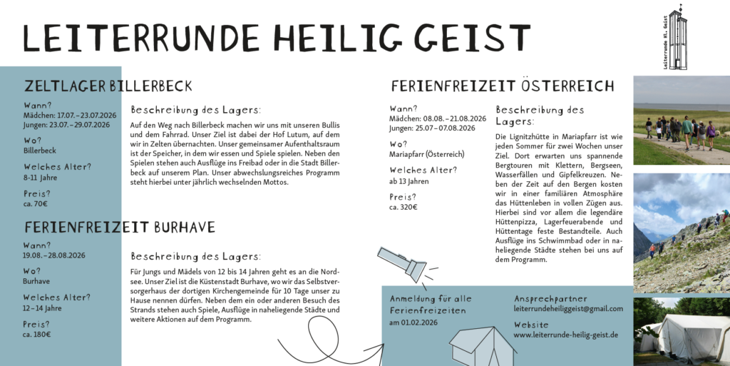 Unsere Termine für die Ferienfreizeiten im Sommer 2026 findest du hier aufgelistet und auch im folgenden Flyer.